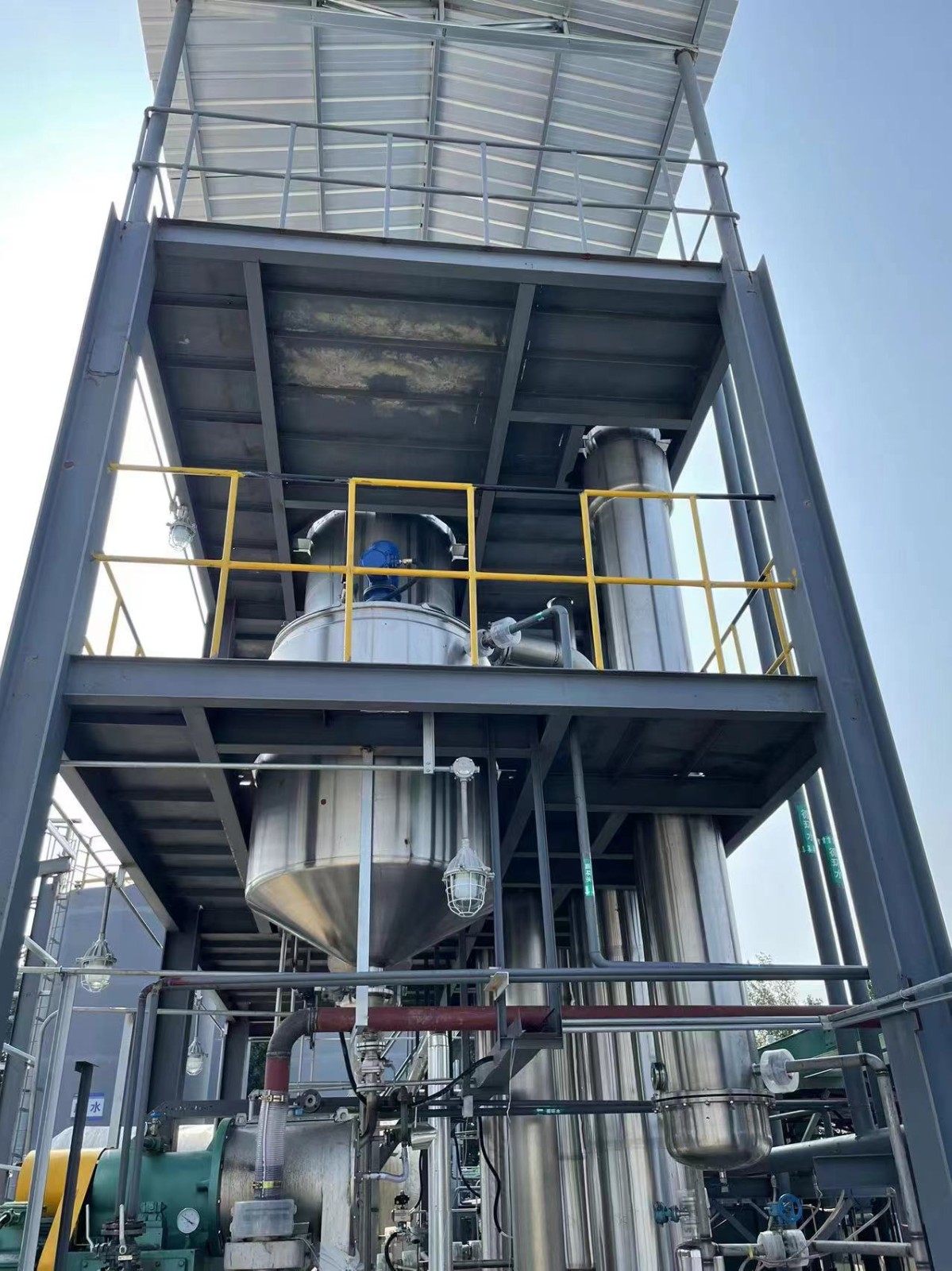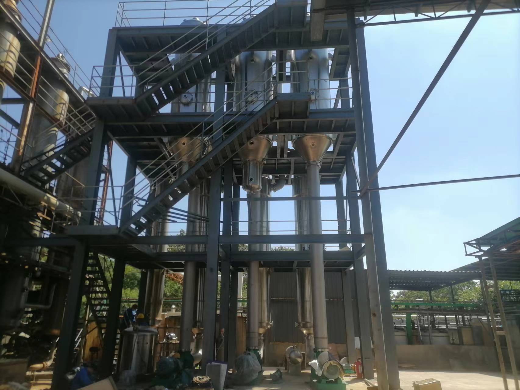 各效加熱器、各效分離器(結(jié)晶器)、冷凝器(混合式或表面式)、熱壓泵、各效強(qiáng)制循環(huán)泵、各效料液輸送泵、真空泵、冷凝水泵、操作平臺(tái)、電器控制柜、液位自控系統(tǒng)及閥門管路等。